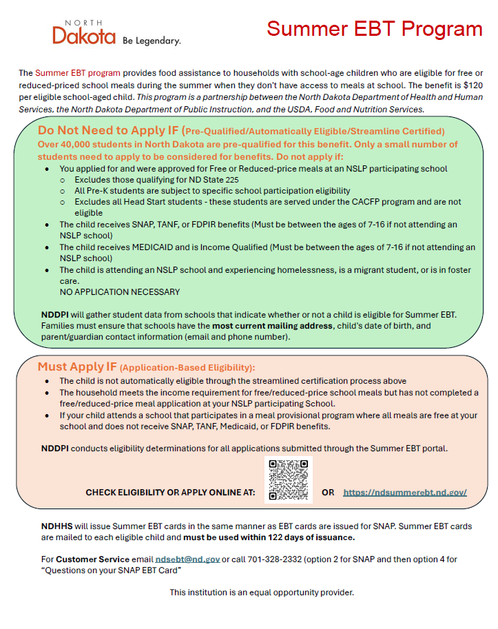 We are excited that Summer EBT (Electronic Benefits Transfer) will be available to eligible families in North Dakota this summer. This program provides additional help for families with children to buy nutritious food when school is not in session. The benefit is $120 per eligible school-aged child and must be used within 122 days of issuance.